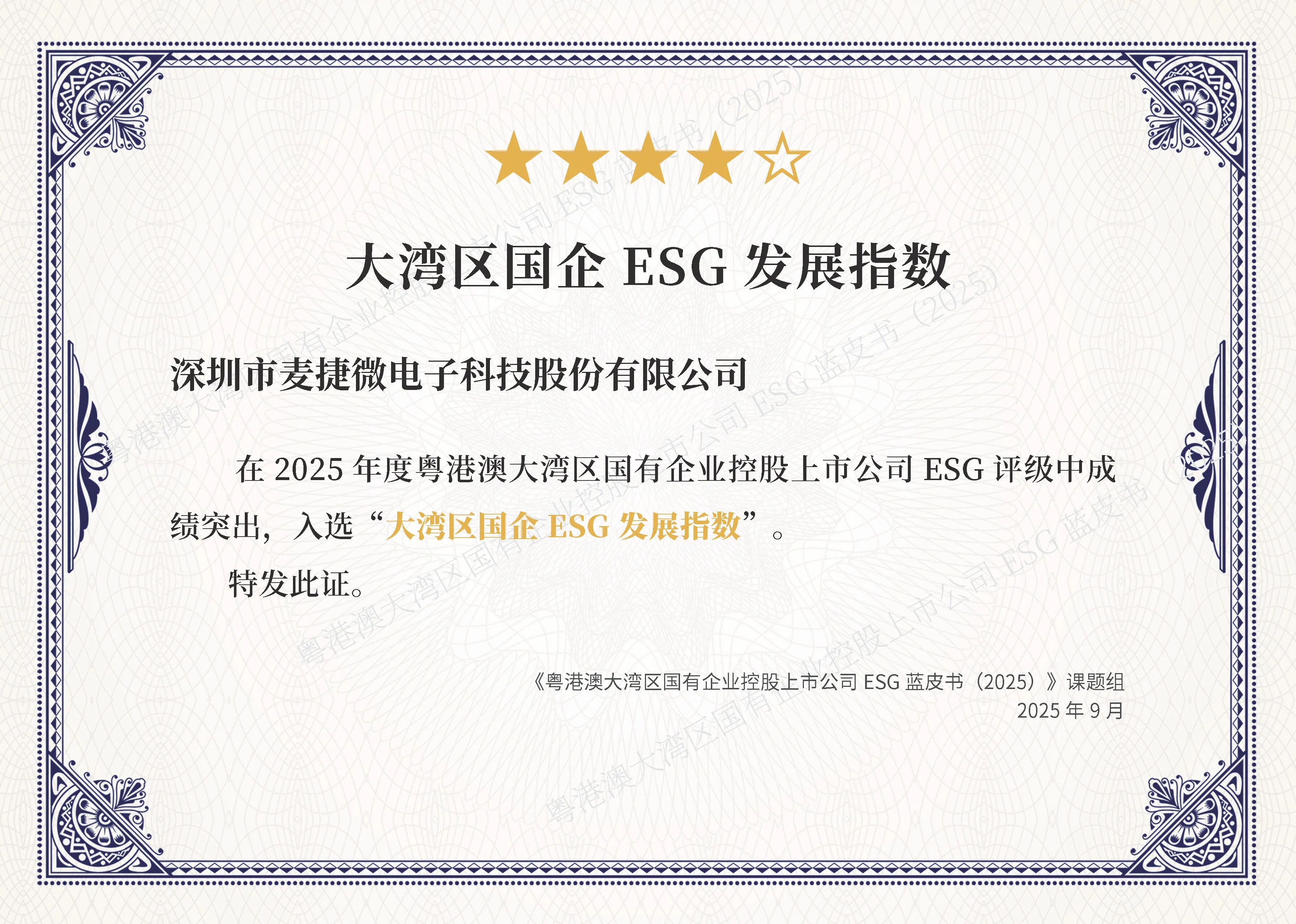 此外,在本次論壇發(fā)布的多項(xiàng)權(quán)威指數(shù)中,特發(fā)集團(tuán)旗下麥捷科技憑借在ESG領(lǐng)域的優(yōu)秀表現(xiàn),首次入選“大灣區(qū)國(guó)企ESG發(fā)展指數(shù)”榜單。本次入選,不僅是對(duì)麥捷科技ESG治理、社會(huì)價(jià)值創(chuàng)造、風(fēng)險(xiǎn)管理等工作的高度認(rèn)可,更是對(duì)麥捷科技踐行可持續(xù)發(fā)展理念的充分肯定。
